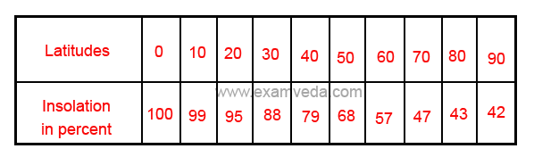 On an average, the amount of insolation received at the earth’s surface decreases from equator towards the poles but there is temporal variation of insolation received at different latitudes at different times of the year.